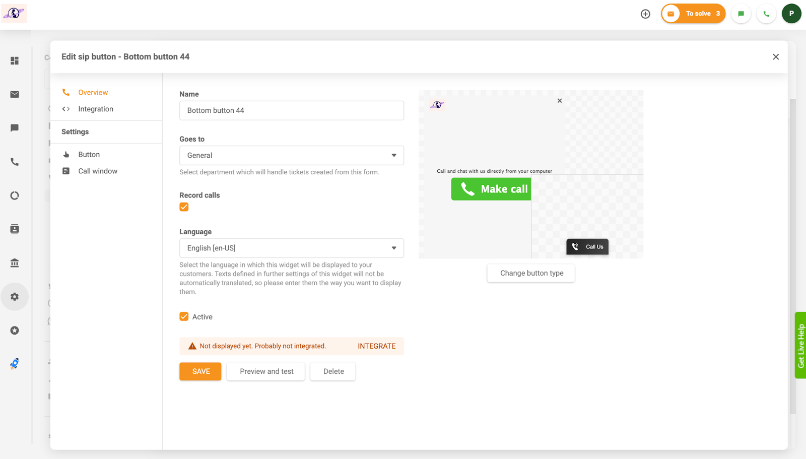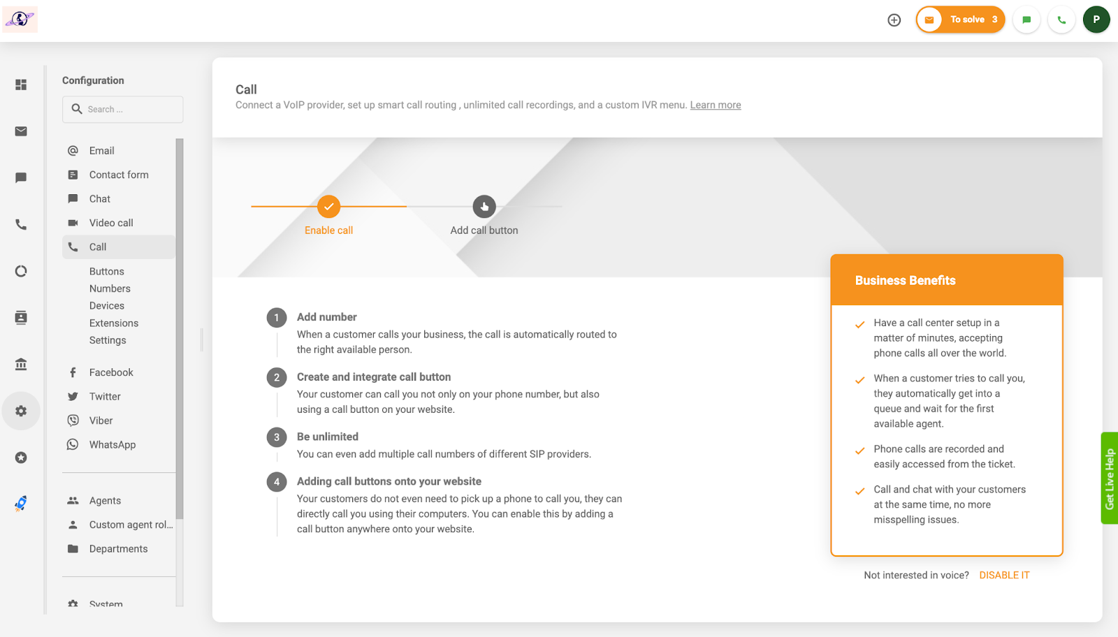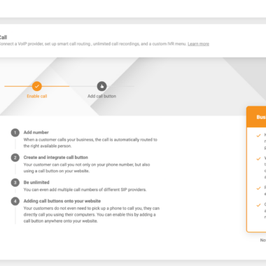 Kiedy skończyłem i wróciłem do pulpitu nawigacyjnego, dodałem logo firmy oraz obsługę komunikacji głosowej, ponieważ ta recenzja będzie skupiać się wokół funkcji call center. Podczas konfigurowania komunikacji głosowej masz możliwość włączenia połączeń wideo lub audio. Wybrałem klasyczną ikonę telefonu, aby zobaczyć, jak mogę dodać swój numer.