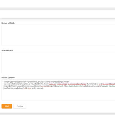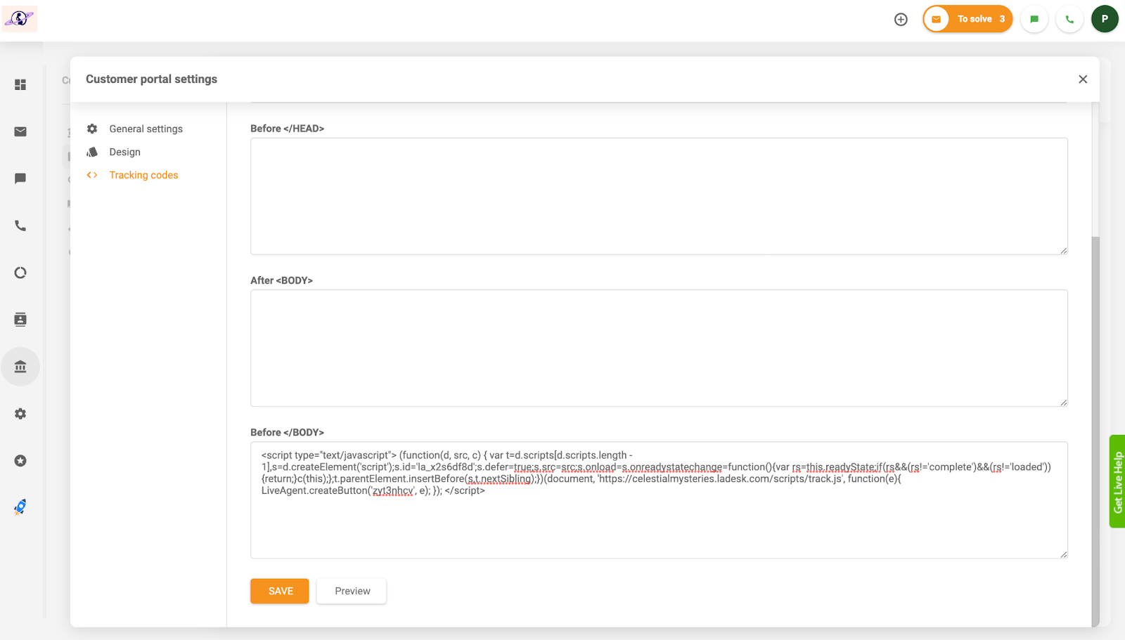 Kiedy wybrałem czerwony przycisk „Zintegruj”, zostałem przeniesiony bezpośrednio do skopiowania kodu html. Przeszedłem do bazy wiedzy za pomocą pulpitu nawigacyjnego (tuż nad przyciskiem ustawień na kartach po lewej stronie), ponieważ tam chciałem przetestować mój przycisk. Przeszedłem do ustawień bazy wiedzy > Konfiguracja ogólna > Kody śledzenia i wkleiłem mój kod html do tej sekcji. Kod można również łatwo skopiować i wkleić na dowolnej stronie internetowej.