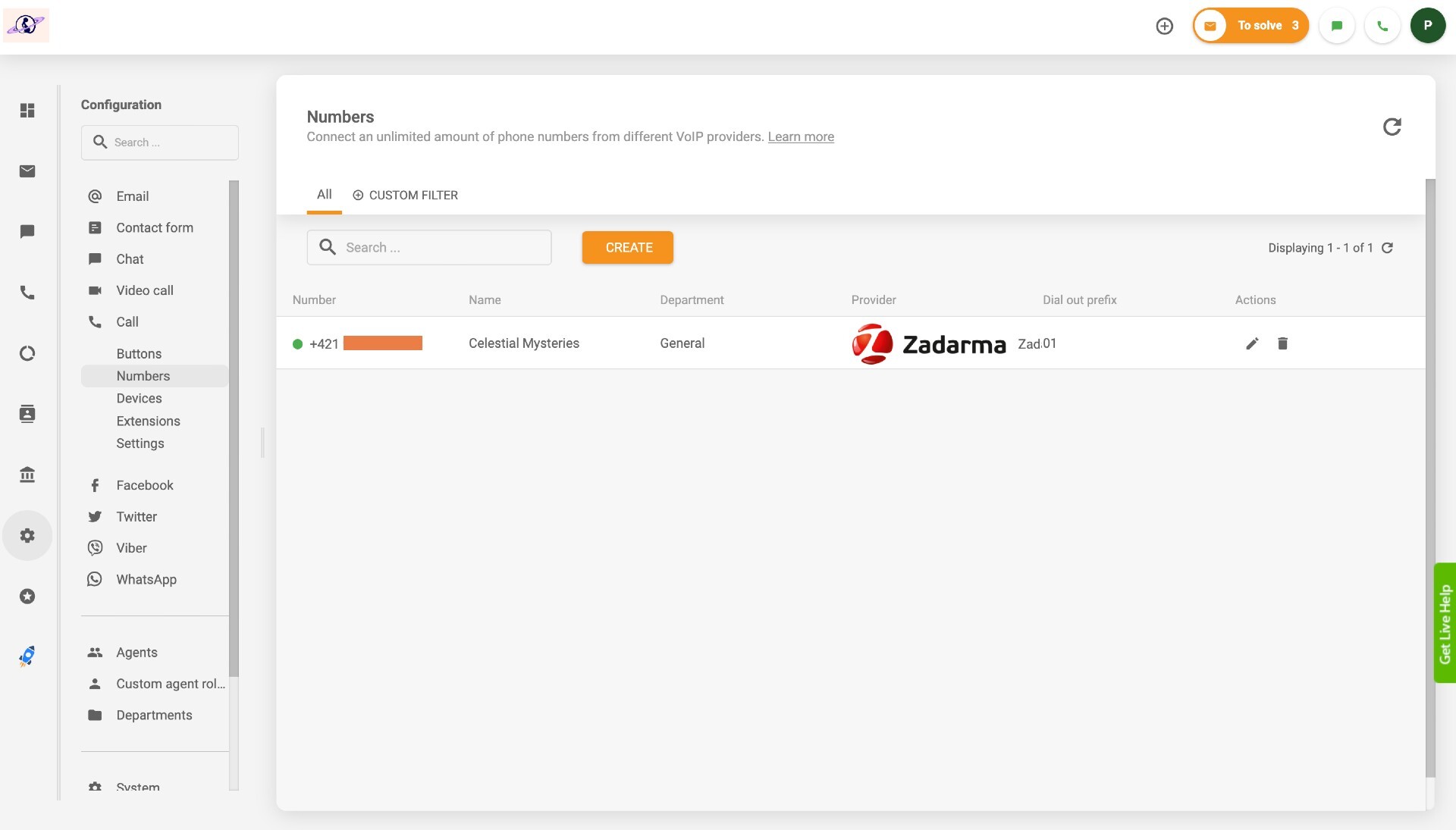 Przeszedłem do Połączenia > Numery, a następnie kliknąłem pomarańczowy przycisk „Utwórz” i dodałem numer z usługi Zadarma VoIP. Istnieje wielu dostawców numerów telefonicznych, więc możesz wyszukać tego, z którego korzystasz, lub po prostu wpisać ogólny numer telefonu VoIP, jeśli nie widzisz swojego dostawcy VoIP na liście. Po wprowadzeniu odpowiednich informacji po prostu kliknąłem „Dodaj” na dole strony i obok mojego połączonego numeru pojawiła się zielona kropka. Wygląda mi to na zielone światło, więc chyba wszystko jest w porządku!