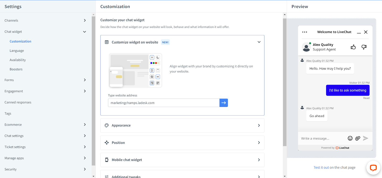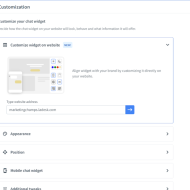 Możesz dostosować widżet czatu w ustawieniach LiveChat. Opcje są dość rozległe, więc jeśli czujesz przypływ kreatywności, możesz dostosować widżet czatu na żywo do swoich preferencji lub brandingu firmy. Twoje wybory obejmują wygląd okna w trybie zmaksymalizowanym i zminimalizowanym, jasny lub ciemny motyw, kolor motywu (obsługiwane są też niestandardowe kolory) oraz pozycję czatu. Istnieje również opcja ukrycia widżetu, dostosowania wersji mobilnej widżetu czatu oraz dodatkowych modyfikacji, dzięki którym możesz zaprezentować logo firmy, zdjęcie pracownika, włączyć lub wyłączyć dźwięki, zezwolić na ocenianie czatu oraz kilka innych opcji.