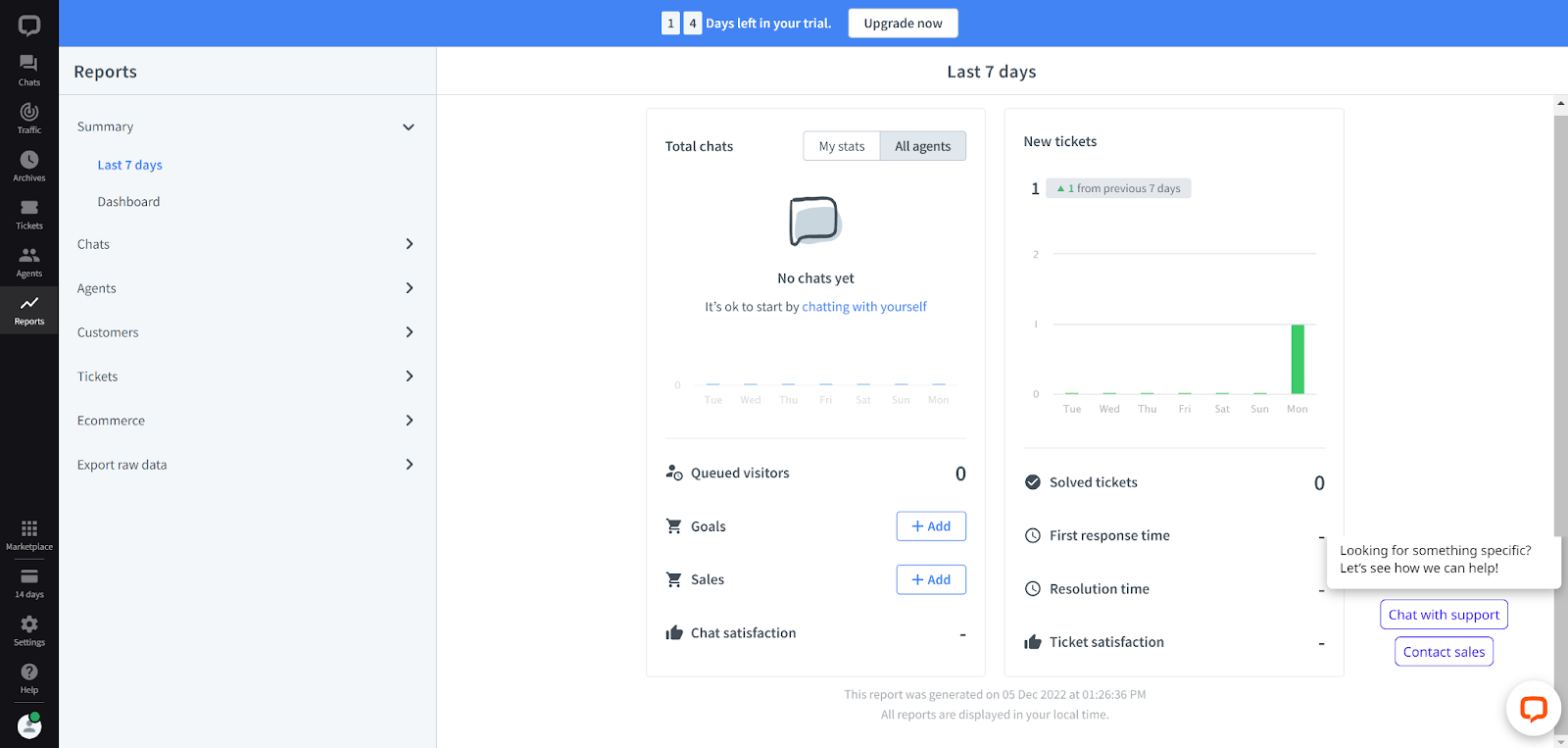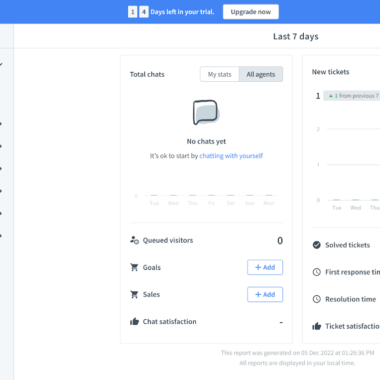 Funkcje analityczne oferują szybki przegląd, jak również dogłębne analizy wszystkich aspektów związanych z czatem na żywo – czatów, agentów, klientów, zgłoszeń i handlu elektronicznego. Każda sekcja może dostarczyć ci więcej informacji i konkretne liczby dotyczące czatu na żywo. Nie brakuje niczego. Analityka zapewnia informacje na temat wszystkiego, co wydarzyło się w ciągu ostatnich siedmiu dni korzystania.