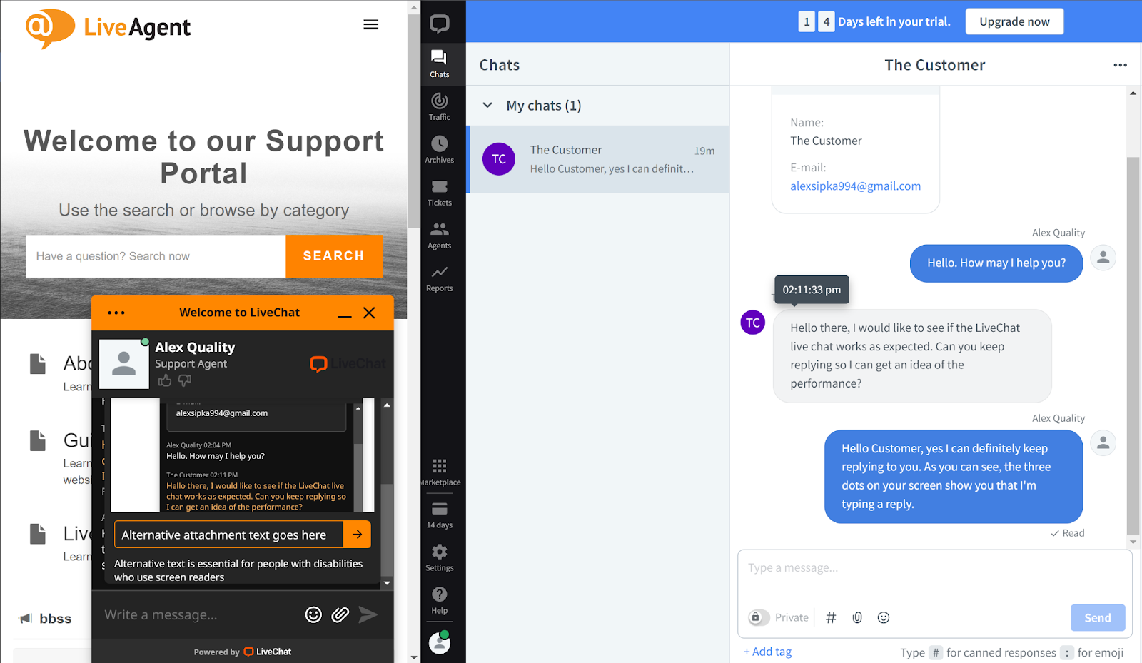 Spróbowałam również wysyłania załączników. Po kliknięciu ikony załącznika możesz natychmiast wybrać plik i wysłać go. Możesz usunąć załącznik w dowolnym momencie przed wysłaniem. W przeciwieństwie do podglądu wiadomości agenci nie mogą zobaczyć załącznika, jeśli nie został jeszcze wysłany, więc prywatność klienta nie zostanie naruszona, jeśli dołączy niewłaściwy plik. Załącznik daje nawet możliwość dołączenia alternatywnego tekstu dla osób z niepełnosprawnościami. To przemyślane i niezwykle użyteczne ułatwienie dostępu.