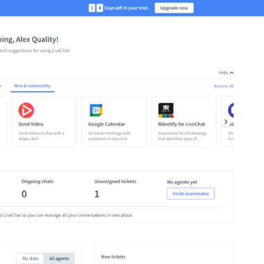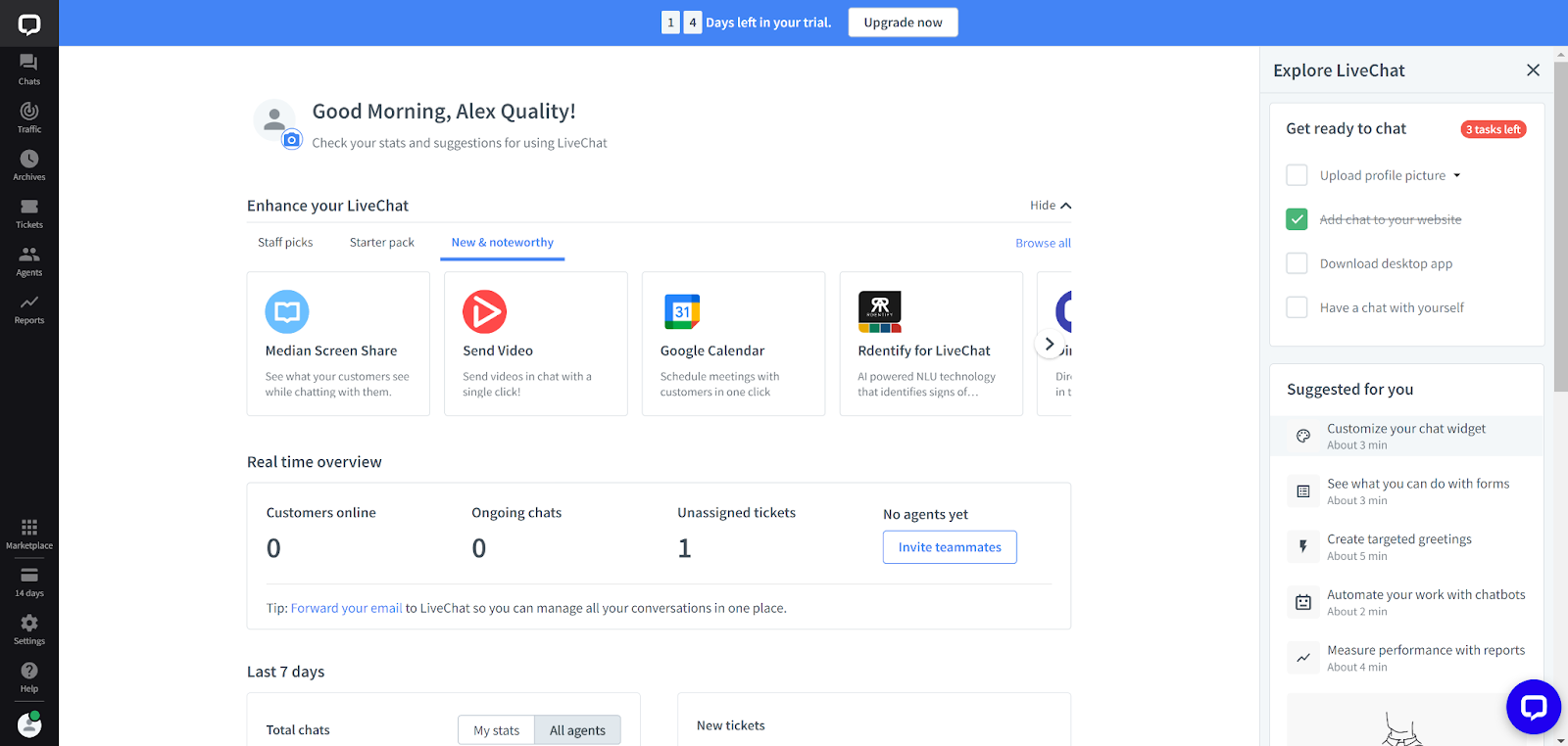 LiveChat to uznane, profesjonalne rozwiązanie, a jego interfejs to odzwierciedla. Bardzo łatwo zapoznać się z większością narzędzi, a sugestie działań do podjęcia po prawej stronie nie pozwolą ci się zgubić. W lewym panelu menu można zobaczyć rozmowy, ruch, zgłoszenia, archiwa, kontakty i wiele więcej. Centrum pulpitu prezentuje kilka opcji usprawnień oraz szybki przegląd statystyk czatu na żywo w czasie rzeczywistym.