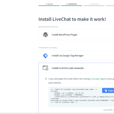 Rejestracja w LiveChat jest bardzo szybka. Po prostu musisz założyć konto, a po chwili przeniesiesz się do części integracji widżetu czatu na żywo, co oznacza, że możesz wdrożyć czat od razu po rozpoczęciu. To zaskakująco szybki proces, a LiveChat daje ci nawet kilka opcji integracji. Możesz wybrać między wtyczką WordPress, Google Tag Managerem lub ręczną instalacją kodu czatu na żywo.